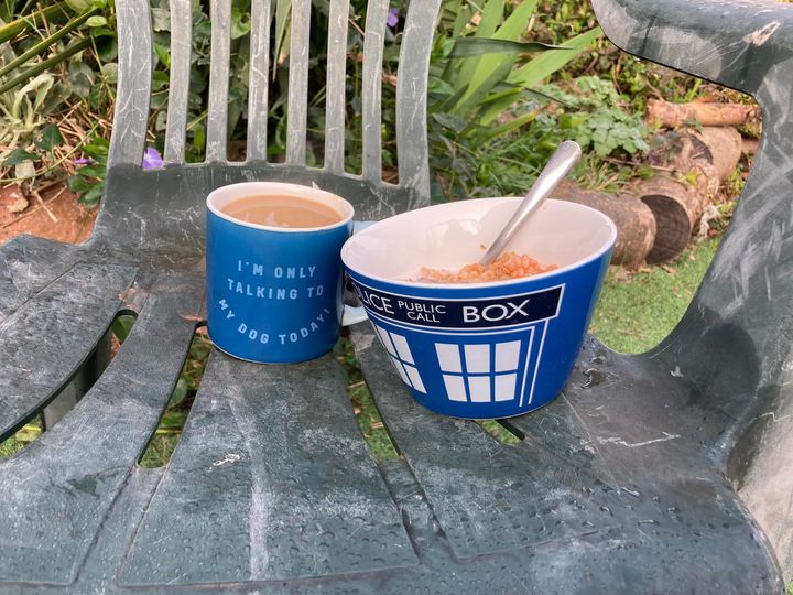 Back from first walk of the day in time for brekkers with the doggie — not that she’d noticed. Too busy zooming around the garden sniffing out whoever might have been in her territory during the night.Funny how the garden sniff’dums takes second place when there’s a breakfast bowl to lick out.
